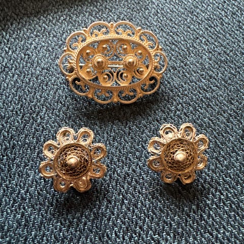 Smykkesett, kjede med anheng, øredobber og ring. Eivind Hillestad.