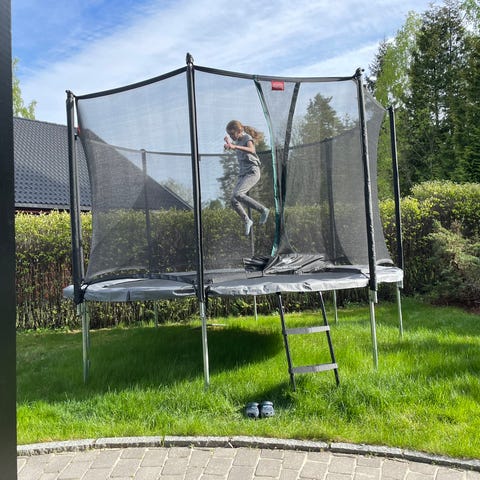 Jumpking trampoline mål 244cm * 350cm og sikkerhetsnett. Trampolinen har en svart hoppflate og grønn beskyttelsespute rundt kanten. Stige følger med. Rammen er laget av galvanisert stål for holdbarhet. Egnet for utendørs bruk.