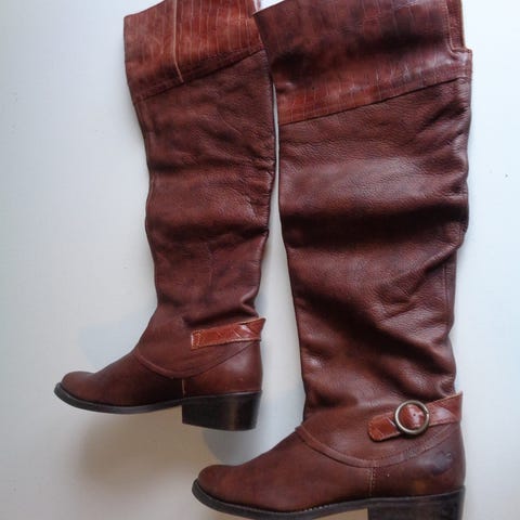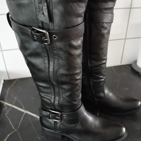 Svarte støvletter i skinn, str 39. Skafte høyde målt foran fra topp til såle : 40 cm. Hælhøyde 5 cm.