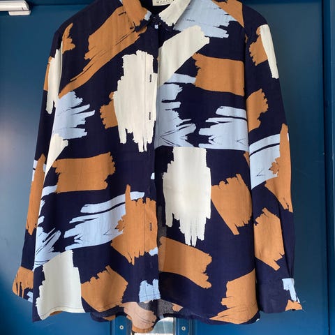 Frisk grønn farge med svart mønster. 100% viskose. Lite og pent brukt, ingen bruksmerker. Ermene er i 3/4 lengden.