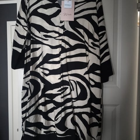 Svart og hvit skjortekjole. Kjolen er lett buet nederst.