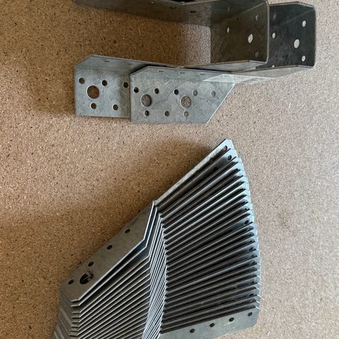 Simpson Strong-Tie monteringsbeslag i galvanisert stål. Ulike størrelser og former for montering og sammenføyning av treverk. Beslagene har flere hull for skruer og spiker, egnet for konstruksjonsarbeid og reparasjoner.