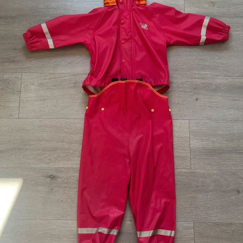 En hel og fin regnsett til barn buksa er str 4 men jakke er str 5. Passer begge deler til 4 til 5 åringer .