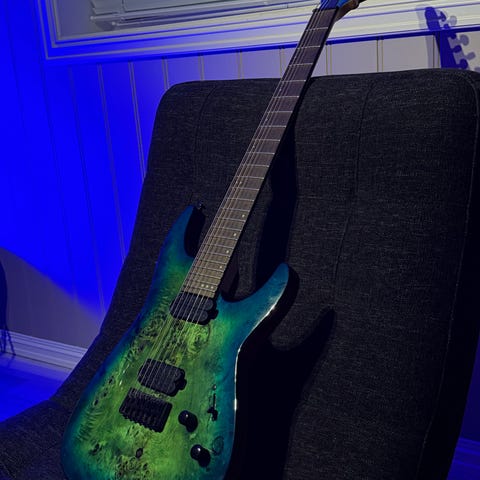 Strøken og nydelig gitar fra selveste Bill Kellihers ønsker og spesifikasjoner. Veldig lettspilt, allsidig og med fantastisk lyd. Seymore duncans, locking tuners og splitcoils og nydelig finish av meget sjelden art. Nypris 21 144 kr på dlx music. Det følger med formfit ESP hardcase. Ser tilsvarende gitar (men ikke farge) ligger ute for 25.000-28.000 hos Gear4music og Evenstad Musikk.