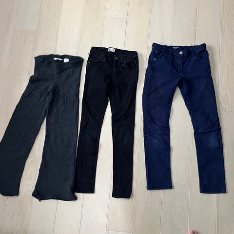 Legging i lys denim og sort, fra HM, str. 146. Kan strammes med strikk på innsiden av livet, myke og stretchy. Litt misfarget nede på bena på den lyse, se siste bilder.