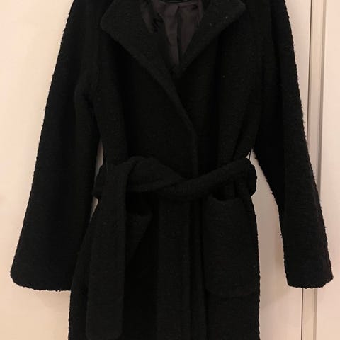 Ganni kåpe i størrelse M for kvinner. Kåpen er i svart fuskepels. Den har dobbeltradet knappelukking og er laget for å gi varme og komfort.
