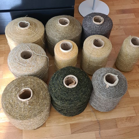 Store spoler med blandingsgarn perfekt for tepper og ryer. Brukes både til vev og tuftepistol. Noen gigaspoler har vi flere av samme farge og noen kun 1 igjen av.