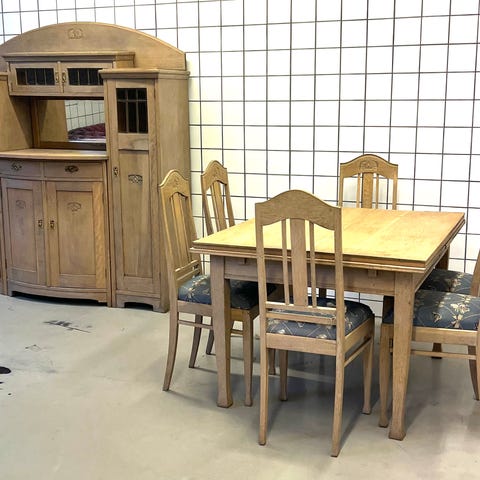 Vintage dansk spisebord med stoler, hjørneskap og skatthold