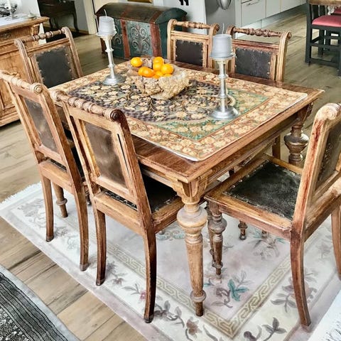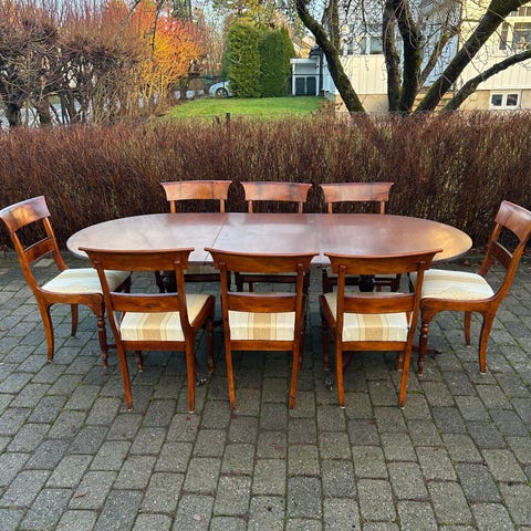 Spisestuebord med to innleggsplater, 6 stoler.