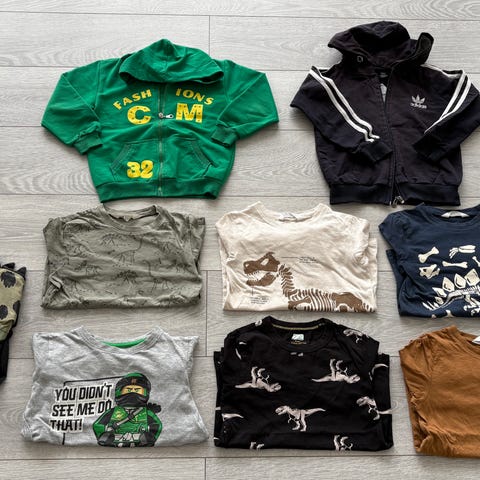 Klespakke selges. Fremstår fint brukt, men normale bruksmerker og flekker må påregnes. Ninjago-tshirt har falmet/slitt trykk.