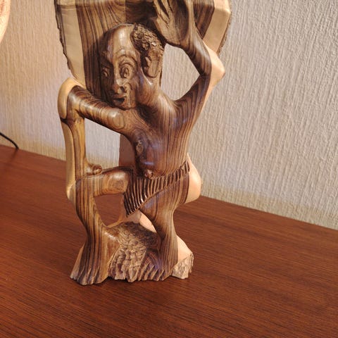 Vintage håndskulptur i hardtre som kan brukes som smykkeringholder eller hylledekorasjon.