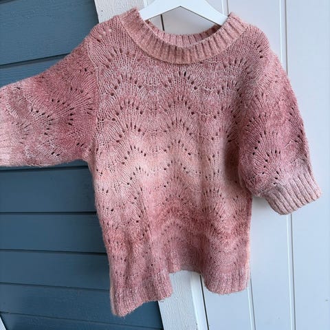 Second Female Genser i størrelse 36, farge rosa. Materialblanding består av 56% mohair, 20% polyester, 16% ull og 8% akryl. Genseren har et mønster med hull og er beregnet for kvinner.