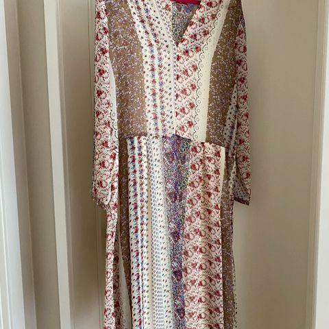 Dea Kudibal kjole i flerfarget mønster, størrelse XL. Kjolen har detaljer som smock på ermer og dekorative bånd i halsen.