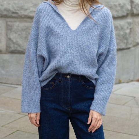Holzweiler ullkåpe i fargen navy, størrelse XL . Jakken er mørk blå og har annen tekstur på ermer enn resten, som skaper en fin kontrast. Jakken er noe nuppete, men med en nuppefjerner blir den så god som ny.