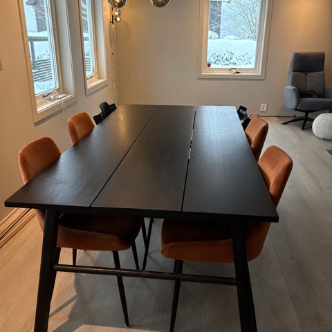 Overflaten på bordet er slitt noen plasser og har noen bruksmerker, men er i heltre og kan enkelt slipes/oljebehandles.