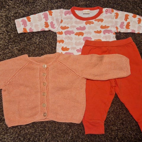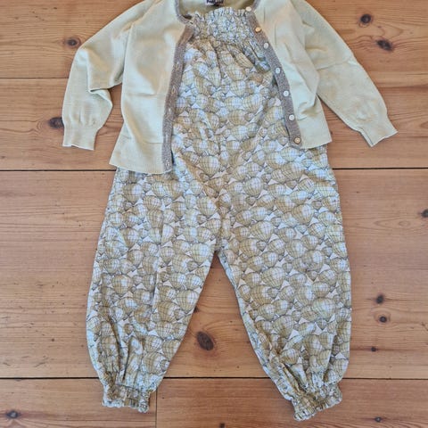 Jakke og bukse sett, strikket i nydelig grønn farge. 100kr.