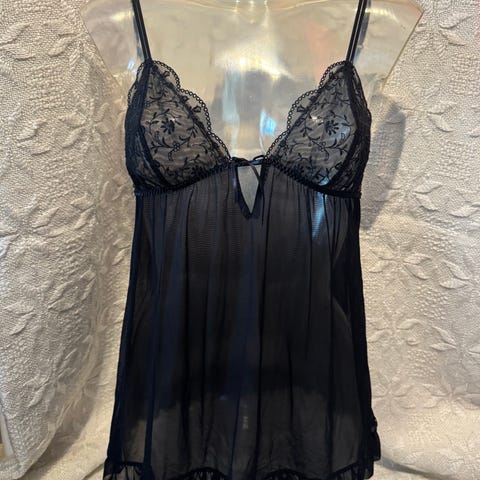 ✨ Selger en tidløs og lekker sort nattkjole med delikat blondeparti over bysten. Perfekt kombinasjon av komfort og eleganse – passer både til hverdags bruk og mer spesielle anledninger.