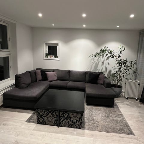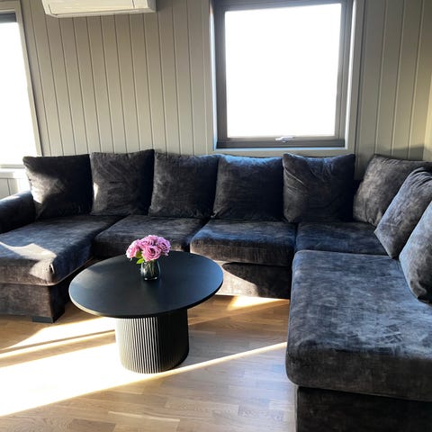 Bildene er fra tidligere eier. Sofaen er lett å rengjøre, bare å tørke over med klut ved søl. Selges videre da den ikke passet så godt i min stue. Det er ett merke v.sjeselong puten, men det synes ikke ved bruk. Fargen er grå-blå. Mangler et bein.
