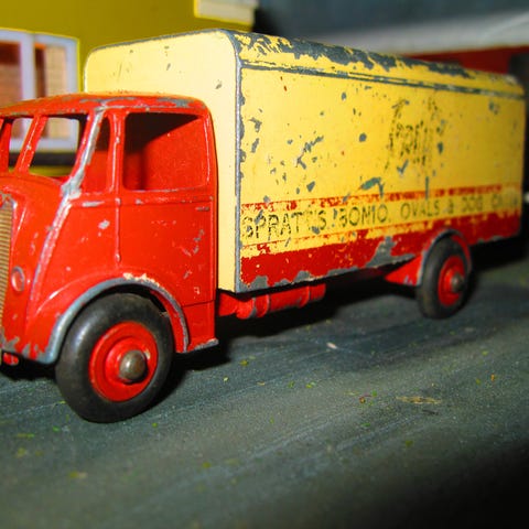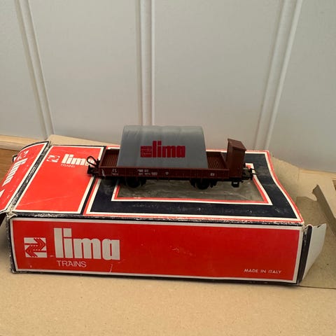 Kibri 10450 modell lastebil med tilhenger i rød farge. Modellen består av en lastebil og en lang tilhenger, laget i plastmateriale. Egnet for modelljernbane eller samling.