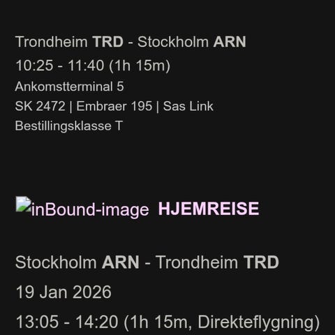 Avreise Stockholm: Søndag 16.november 2025 kl 17:00, ankomst Trondheim 18:40(direkte fly)