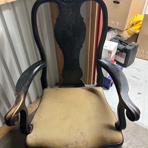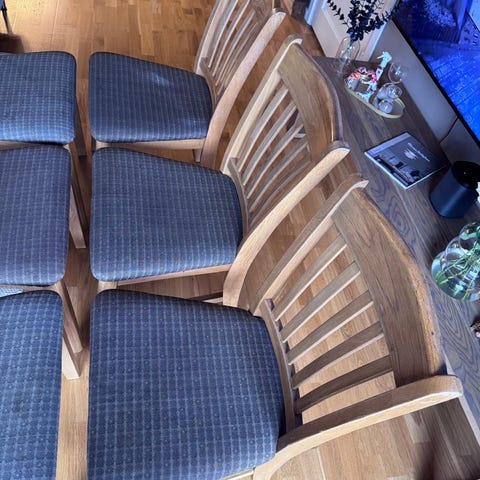 Selger 8 stoler i heltre eik. 2 stk med armlener og brunt sete, 6 stk uten armlener med gulmønstret sete. Fargen er dempet sort.