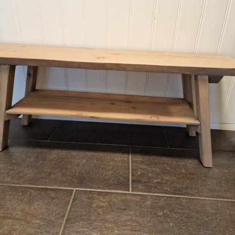 Benk, sittebenk, krakk, håndlaget, utebenk, minimalist, ubehandlet, heltre, bålpanne, bord, salongbord, sofabenk,