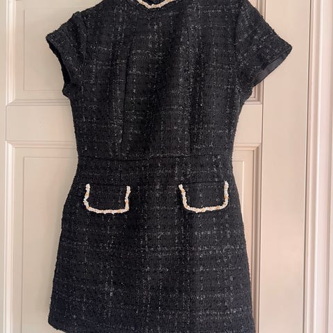 Michael Kors kjole for kvinner i størrelse M. Laget av svart og hvit tweedstoff med teksturert overflate. Ermeløs design med rund hals og glidelås bak. Innerfôr i glatt materiale. Passer til formelle eller semi-formelle anledninger.