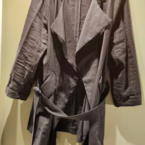 H&M Andre jakker i flerfarget design, størrelse L for damer. Jakken har knappelukking foran, ribbestrikkede kanter ved ermer og hals, samt lommer foran. Materialet er mykt med en blanding av farger i gråtoner, beige og mørk lilla. Jakken har en løs passform og er egnet for hverdagsbruk.