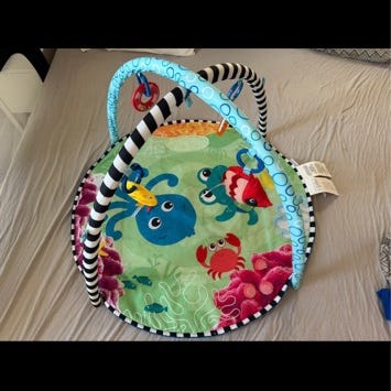 Fint brukt babygym🙂 de fire leker følger med. Er i et lett vaskbart stoff. Mange fine farger og effekter som babyer synes er spennende.