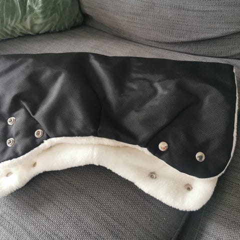 Barnevognsmuffe/ håndmuffe til barnevogn. Veldig praktisk, lett å feste på vogna. Holder hendene varme på vinteren, når man glemmer vottene hjemme.