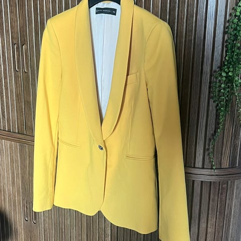 Ellos rutete blazer jakke i størrelse S for kvinner. Jakken har et grått rutemønster og dobbeltradet knappelukking. glatt innside med svart fôr. Passer til formelle og uformelle anledninger.