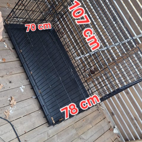 Hundebur til stor hund selges. Den har fått noe små hull foran i nettet men har ikke noe betydning for bruk. Kan rulles ned 'gardiner' på sidene og foran om hunden skal ikke ha innsyn, kan åpnes på 4 sider. Tar lite plass når den er demontert. Mål 90x65x60