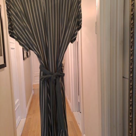 Vinrød kjole i mønstret stoff ytterst og hel foret innvendig. Glidelås bak.