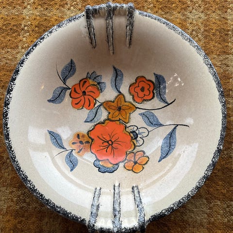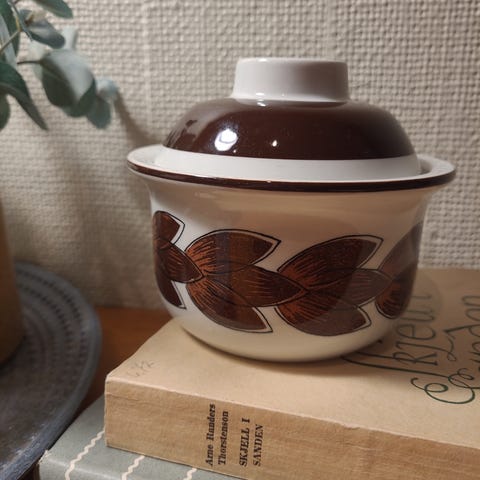 En flott skål fra Stavanger flint. Ser aldersspor i lokket, men hver sin sjarm! Gul og flott lokk!