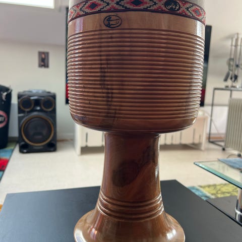 Tror den er laget i kobber. I fin stand. darbuka, et begerformet håndtromme som er mye brukt i Midtøsten, Nord-Afrika og Balkan.