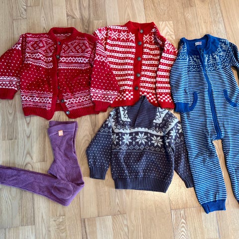 Selger flotte og varme hjemmestrikket gensere og bukser i ull. Alle klærne er pent brukte uten synlig slitasje eller andre merknader.