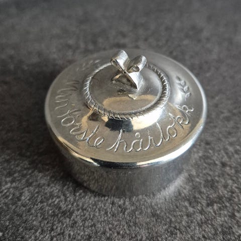 Mulig sølvbelagt metall. Litt usikker. Ikke stemplet