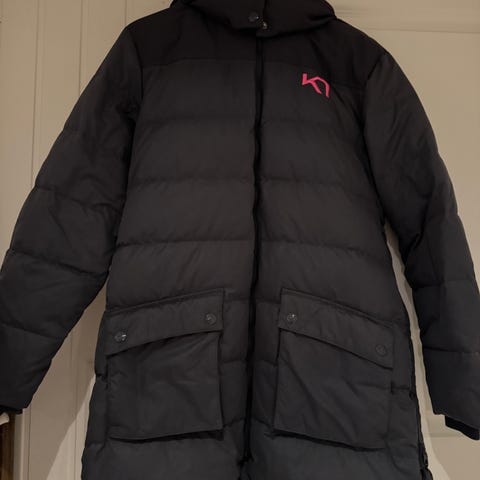 Selger min pent brukte Kari Traa vinterjakke i størrelse L for kvinner. Jakken er grå med oransje innerstoff. Bildet er tatt med og uten blits.