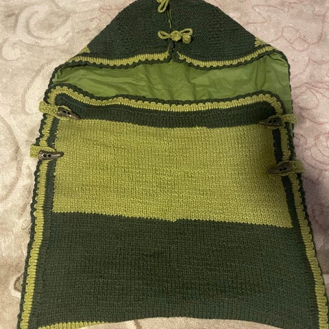 Nydelig strikket bilstolpose i Mariusmønster. Posen har vært prøvd én gang, så den fremstår som helt ny. Strikket med tykt og godt ullgarn.