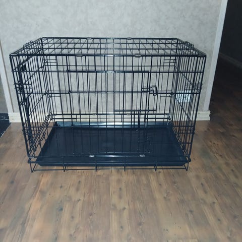 Selger to stålbur fra Buddy. Burene er sammenleggbare, og har to dører; en foran og en på siden. Kan følge med puter til bura (de har noen flekker) og vannskåler om ønskelig.