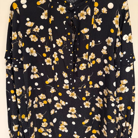 Nydelig silkebluse med lang skjerf…som kan knytes som sløyfe eller to ganger rundt halsen++Rett og ledig i fasongen.Bet.5300kr for den i Ulsteinvik.aBrukt kun to ganger.Jeg er 168 cm.og rekker til midt på hofta.Fin volang på ermene