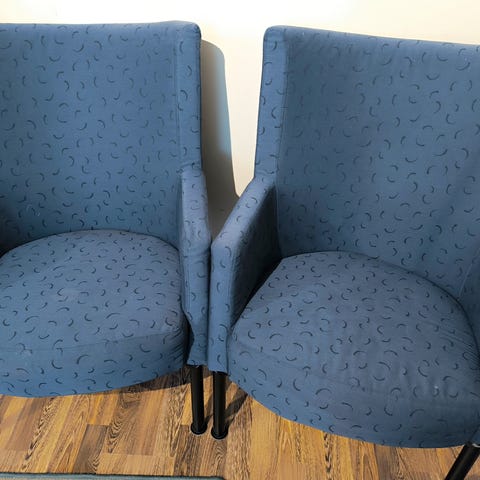 Stolene er i god stand. Noen merker på stoffet på enkelte av stolene, det kan mest sannsynlig vaskes bort, jeg har ikke prøvd. Se bilder.