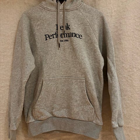 Peak Performance hettegenser for kvinner i størrelse S. Genseren er grå og laget av 70 % bomull og 30 % polyester. Den har hette med snøring og en frontlomme. Passer til hverdagsbruk og utendørsaktiviteter.