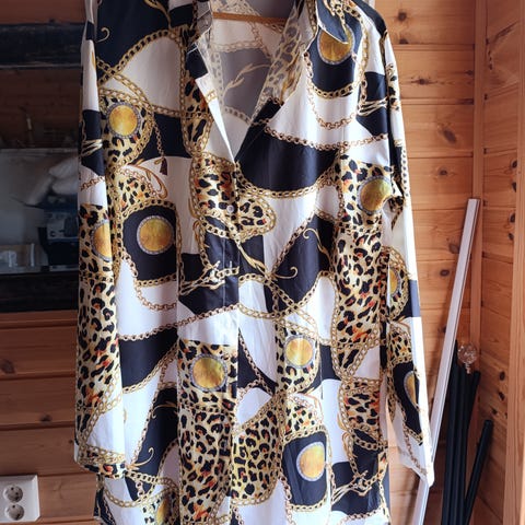 Gullmønstret damedress, størrelse XL. Jakke og bukse har et dekorativt mønster. Materiale av 95% polyester, og 5% spandex. Egnet til hverdags, fest, eller til formelle anledninger.