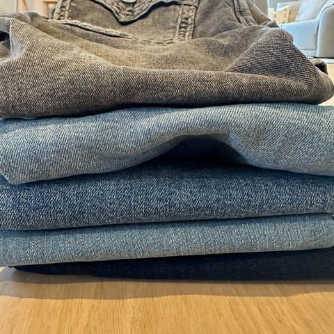 8 jeans, litt av blå og brun farge.