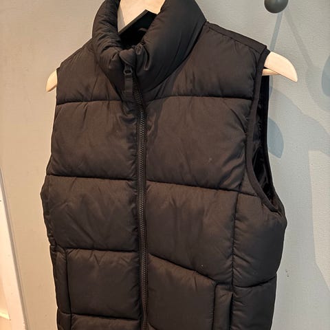 Cubus vattert vest i svart farge, størrelse 158, egnet for barn og unisex bruk. Vesten har knappelukking foran og er laget i et materiale som gir isolasjon og varme.