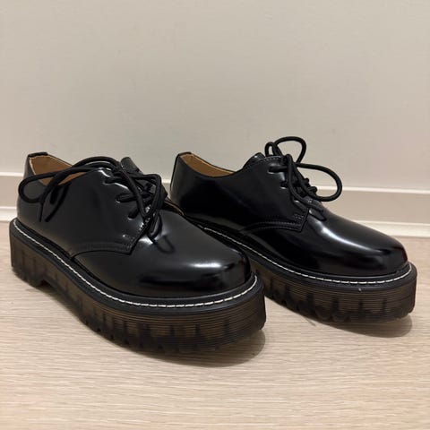 Zara sko i størrelse 36, som ny. Skoene er svarte med lakkerte overflater og har en tykk, svart såle med en brun kant. Modellen har snøring foran og hæl med en liten hempe bak.