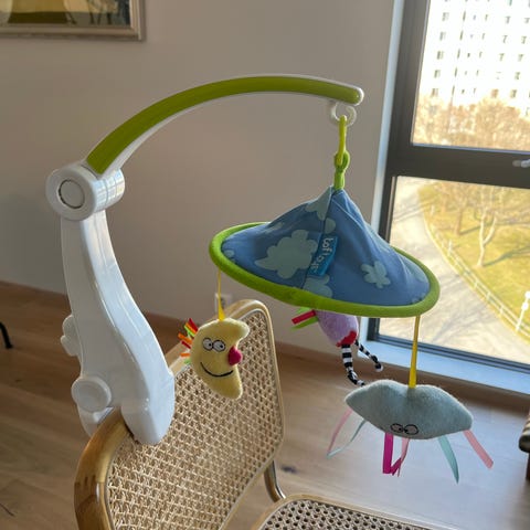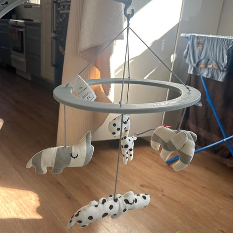 Helt, fint uro med musikk fra done by deer. Veldig lite brukt siden begge barn sovet ikke i sprinkelseng eller ligger der mye.