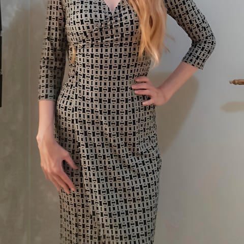 Fin hverdagskjole, perfekt for høsten. Fôret, har reglan-ermer, stoffet er ullblanding. Dessverre litt for liten for meg. Brukt bare et par ganger.