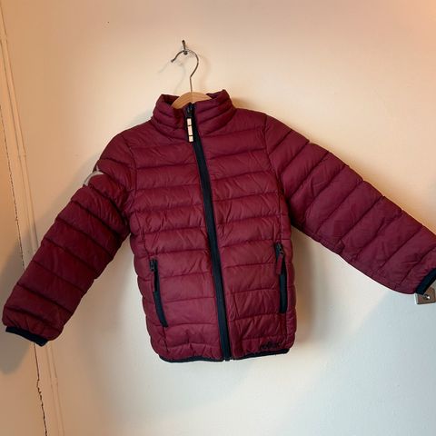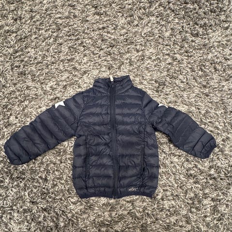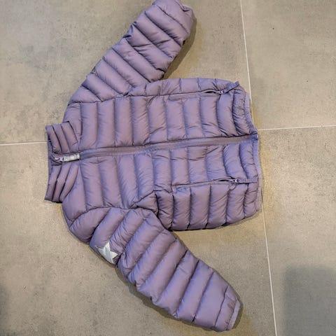 Selger en fin dunjakke i mørkeblå med stjerner på armene, noen små hull her og der som burde syes, eller i god stand.